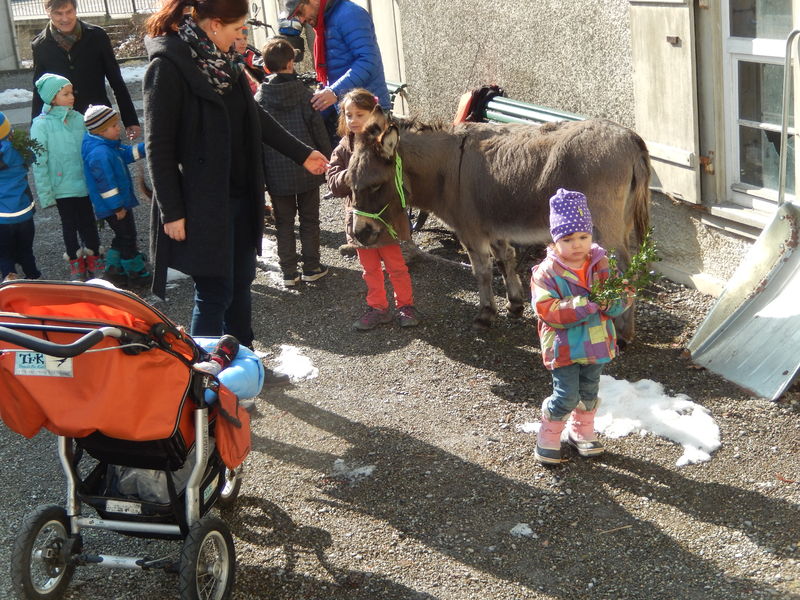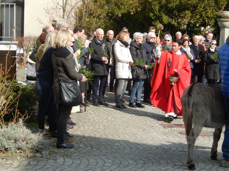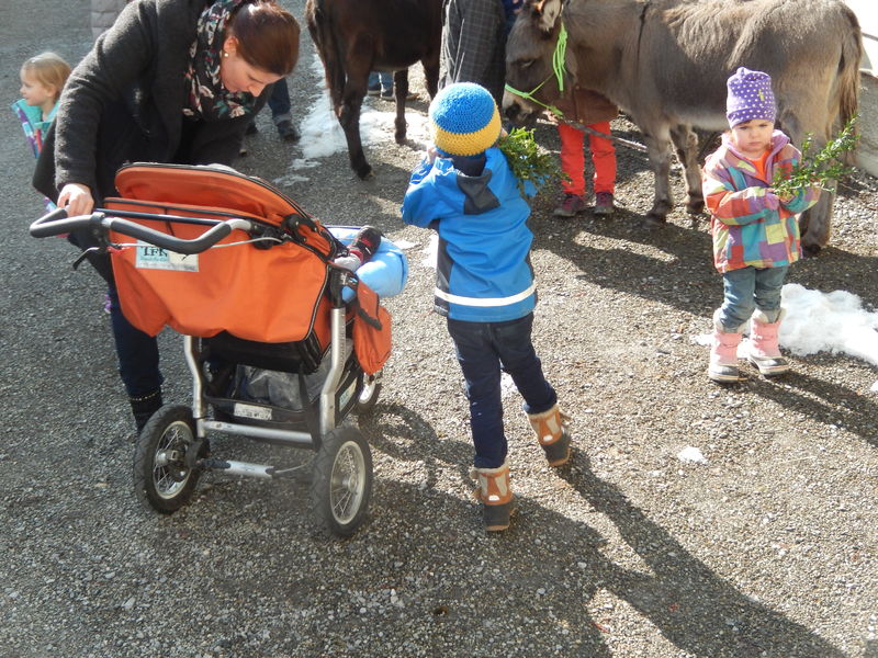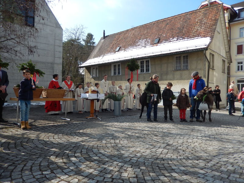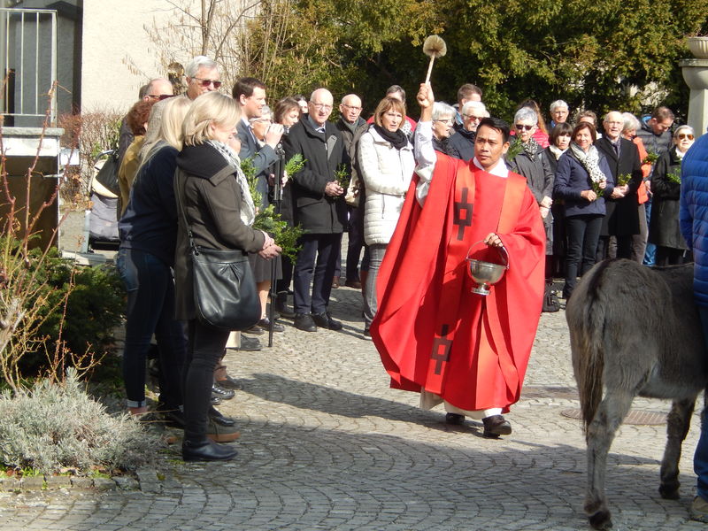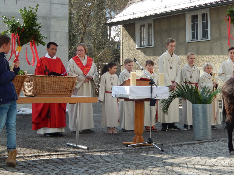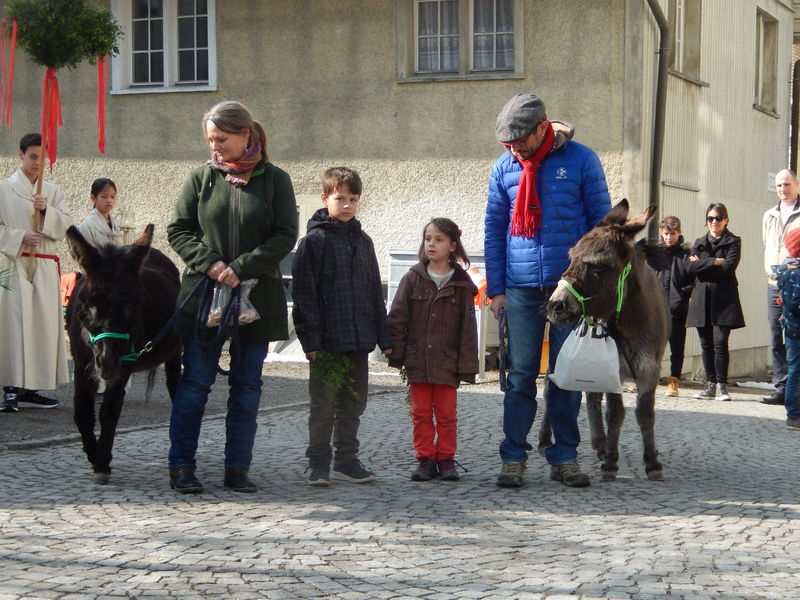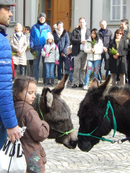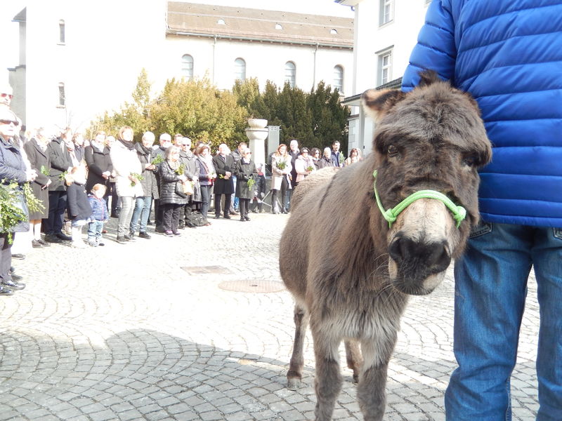 Am Palmsonntag feierte die Pfarrei St. Georgen den einzug Jesu mit speziellen Gästen: Nana und Joli, zwei Eselinnen, die mit "ihren" Gedanken auch die Predigt hielten.